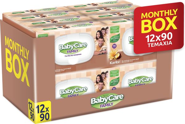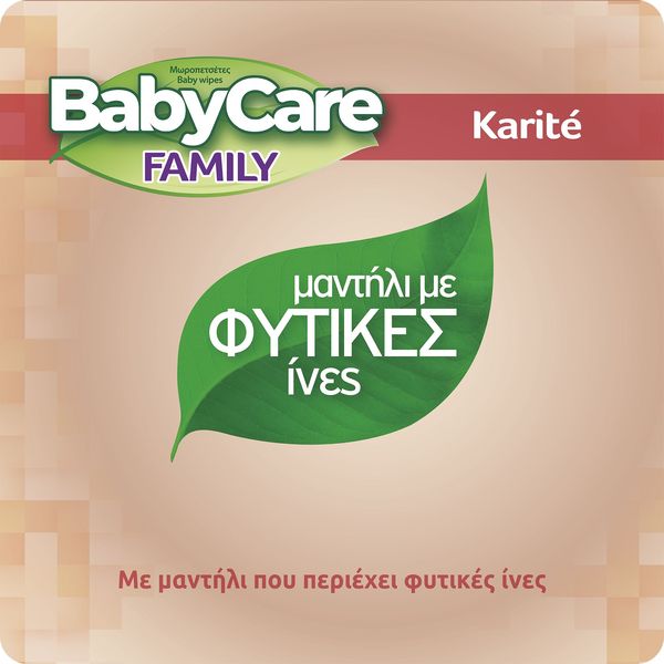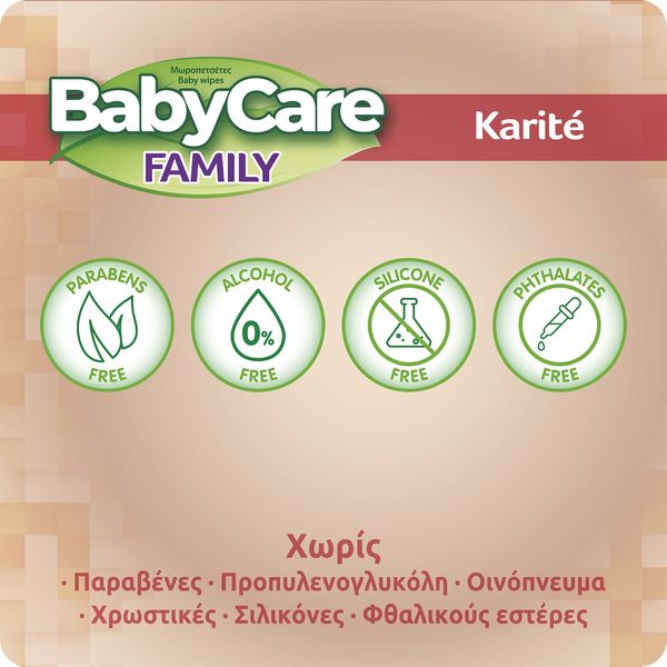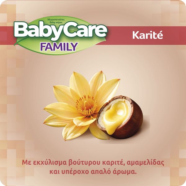 Τα υγρά μαντήλια BabyCare Family Karite σχεδιάστηκαν για όλη την οικογένεια (μωρά, παιδιά, ενήλικες), για extra υγιεινή και απαλή περιποίηση της επιδερμίδας, κάθε μέρα. Συμπληρώνουν επίσης το κοινό χαρτί τουαλέτας, για έναν αποτελεσματικό καθαρισμό. Εξαιρετικά ανθεκτικά και πολύ απαλά και με ειδικά μελετημένη σύνθεση με εκχύλισμα βουτύρου καριτέ και αμαμελίδας, αφήνουν μια μοναδική αίσθηση καθαριότητας και βαθιάς φροντίδας. Με υπέροχο απαλό άρωμα. Με πρακτικό καπάκι που ανοιγοκλείνει για ασφαλή διατήρηση της υγρασίας του προϊόντος, χωρίς να στεγνώνει. -Συνιστώνται από την Ελληνική Εταιρεία Παιδιατρικής Δερματολογίας. -Δερματολογικά ελεγμένα. -Χωρίς παραβένες, σαπούνι, οινόπνευμα, ορυκτέλαια, αλουμίνιο. -Χωρίς δοκιμές σε ζώα. Εμπλουτισμένο με εκχύλισμα βουτύρου καριτέ και αμαμελίδας.Πάνω απο 96% αγνό νερό.Σε 100% ανακυκλώσιμη συσκευασία.OEM: 07871Π