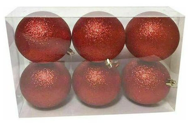 Μπάλες με γκλίτερ για την διακόσμηση του χριστουγεννιάτικου δέντρου σας. • Υλικό: Πλαστικό. • Διάμετρος: 10 cm. • Τεμάχια: 6 τμχ. • Χρώμα: Κόκκινο. • Εγγύηση: 2 χρόνια.