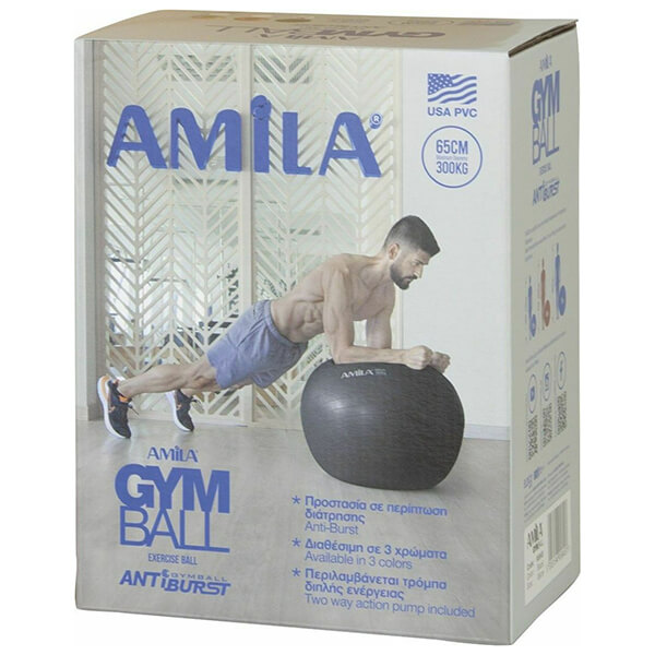 Μπάλα γυμναστικής Amila, κατασκευασμένη από USA PVC με ιδιαίτερη αντοχή, αντιολισθητικότητα και τεχνολογία Antiburst. Η τεχνολογία Antiburst σας προστατεύει σε περίπτωση τρυπήματος της μπάλας να μην τραυματιστείτε από την εκτόνωση του αέρα. Η AMILA GYMBALL μπορεί να χρησιμοποιηθεί εκτός από αξεσουάρ εκγύμνασης σαν καρέκλα στο γραφείο σας, ή στο σπίτι σας. Καθήμενοι σε μια AMILA GYMBALL έχετε καλύτερη στάση σώματος, καλύτερη κυκλοφορία του αίματος, μείωση στους πόνους της μέσης καλύτερη ισορροπία αλλά και εκγύμναση του κορμού και των κοιλιακών λόγω ενεργοποίησης των σταθεροποιητικών μυών. Φέρνοντας σε ισορροπία το σώμα σας, η μπάλα ισορροπίας της AMILA μπορεί να στηρίξει την μέση σας, να μειώσει τον οσφυϊκό πόνο, να βελτιώσει την κινητικότητα, να βελτιώσει την εξάσκηση στο Pilates. Διάμετρος: 75 cm.Αντοχή: 300 Kg.Υλικό: PVC.Πάχος Υλικού: 1.5 mm.Τρόμπα: Ναι.Βάρος: 1700 gr.Χρώμα: Γκρι.Εγγύηση: 2 χρόνια.