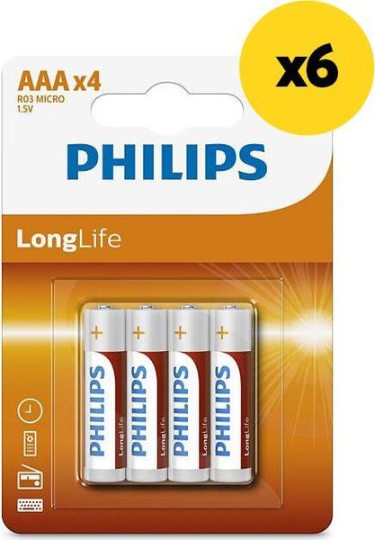 Μπαταρίες Philips Longlife χωρίς καθόλου βαρέα μέταλλα όπως κάδμιο και μόλυβδο. Ιδανικές για συσκευές χαμηλής κατανάλωσης όπως ρολόγια, τηλεχειριστήρια, ραδιόφωνα, αριθμομηχανές κλπ. Μέγεθος: AAA. Τύπος: Zinc-Carbon. Τεχνικά Χαρακτηριστικά: 1,5V, R03, Micro. Συσκευασία: 24 μπαταρίες. Ιδανικό για: Ρολόγια, τηλεχειριστήρια, ραδιόφωνα, αριθμομηχανές κλπ. Εγγύηση: 6 μήνες.