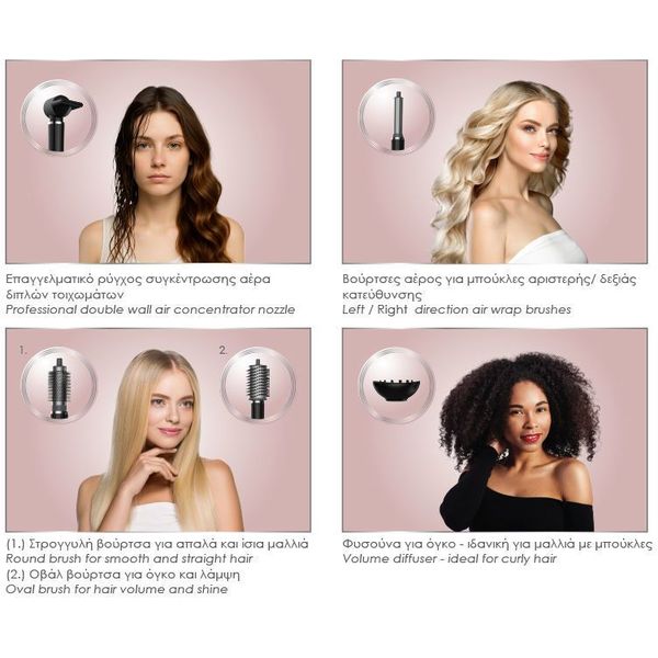 Εξαρτήματα: Κεφαλή σεσουάρ με ρύγχος, φυσούνα για όγκο, Οβάλ βούρτσα, Στρογγυλή βούρτσα, Βούρτσες αέρος για μπούκλες αριστερά/δεξιά