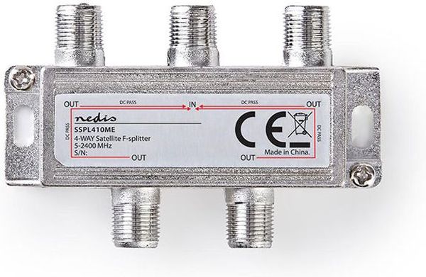 > > > NEDIS SSPL410ME SATELLITE F-SPLITTER MAX. 11.5 DB INSERTION LOSS 5 - 2400 MHZ 4 OUTPUTS