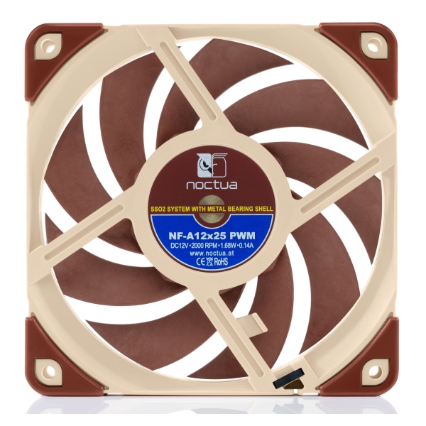 Διαθέτοντας προηγμένα μέτρα αεροδυναμικής σχεδίασης, όπως τα κανάλια επιτάχυνσης ροής και το πλαίσιο AAO της Noctua, ο NF-A12x25 είναι ένας εξαιρετικά βελτιστοποιημένος, υψηλής ποιότητας ανεμιστήρας μεγέθους 120x25mm. H έκδοση 4-pin PWM υποστηρίζει πλήρης αυτόματο έλεγχο ταχύτητας σε μητρικές με PWM fan headers και περιλαμβάνει αντάπτορα Low Noise (L.N.A), που μειώνει την μέγιστη ταχύτητα περιστροφής από 2000 σε 1700rpm. Η εκπληκτική ομαλή λειτουργία του, η φέρουσα κλάση SSO2 και η κορυφαία ποιότητα του Noctua, το καθιστούν ιδανικό για υψηλότερες απαιτήσεις. Διαστάσεις: 120x120x25 mm.Bearing: SSO2.Υλικό: Sterrox LCP.Ταχύτητα περιστροφής: 2000 RPM (+/- 10%).Ταχύτητα περιστροφής με L.N.A: 1700 RPM (+/- 10%).Ελάχιστη ταχύτητα περιστροφής: 450 RPM (PWM, +/-20%).Ροή αέρα: 102,1 m³/h.Ροή αέρα με L.N.A.: 84,5 m³/h.Ακουστικός θόρυβος: 22,6 dB(A).Ακουστικός θόρυβος με L.N.A.: 18,8 dB(A).Στατική πίεση: 2,34 mm H2O.Στατική πίεση με L.N.A.: 1,65 mm H2O.Συνδεσιμότητα: 4-pin PWM.Μήκος καλωδίου: 20cm + 30cm NA-EC1 καλώδιο επέκτασης.Μέγιστη ισχής εισόδου: 1,68 W.Μέγιστο ρεύμα εισόδου: 0,14 A.Τάση σε λειτουργία: 12 V.Τάση σήματος PWM: 5 V.MTTF: > 150.000 ώρες.Εγγύηση: 6 χρόνια. DOA 7 ημερών
