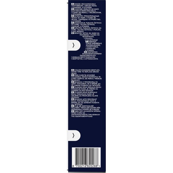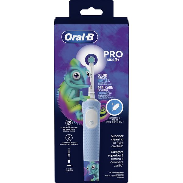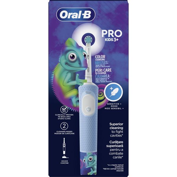 Oral-B Pro Kids Chameleon Ηλεκτρική Οδοντόβουρτσα (για παιδιά 3+ ετών) Η Oral-B Pro Kids Chameleon είναι η τέλεια εισαγωγή στην στοματική υγιεινή για παιδιά άνω των 3 ετών. Διαθέτει μια απαλή κεφαλή σχεδιασμένη για μικρά στόματα, ενώ η ηλεκτρική λειτουργία εξασφαλίζει αποτελεσματικό καθαρισμό των δοντιών και των ούλων, βοηθώντας στην πρόληψη της τερηδόνας. - Ειδικά σχεδιασμένη για παιδιά: Ιδανική για παιδιά από 3 ετών και άνω, με διασκεδαστικό design και άνετο κράτημα.