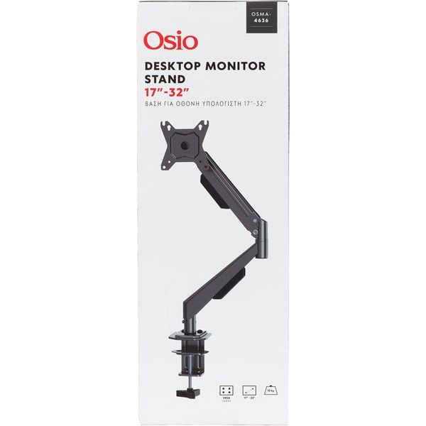 Αναβαθμίστε τον χώρο εργασίας σας με τη βάση στήριξης γραφείου OSMA-4636, ιδανική για οθόνες υπολογιστή διαστάσεων 17 έως 32 ίντσες. Η βάση διαθέτει στιβαρή κατασκευή και μπορεί να υποστηρίξει οθόνες με μέγιστο βάρος έως 10 κιλά, ενώ το μέγιστο ύψος της φτάνει τα 515 χιλιοστά, εξασφαλίζοντας εργονομική και άνετη χρήση. Η βάση είναι συμβατή με το πρότυπο VESA 100x100, παρέχοντας εύκολη και ασφαλή εγκατάσταση. Στη συσκευασία περιλαμβάνεται πλήρες σετ στερέωσης, που επιτρέπει την άμεση τοποθέτηση τόσο στο γραφείο όσο και στην οθόνη σας. Ιδανική για οικιακή και επαγγελματική χρήση, αυτή η βάση στήριξης συνδυάζει λειτουργικότητα και άνεση, κάνοντας την εργασία σας πιο αποδοτική. - Bάση στήριξης γραφείου για οθόνη υπολογιστή