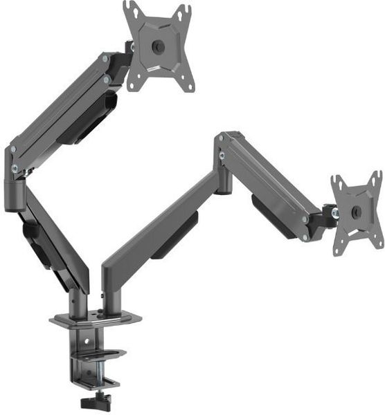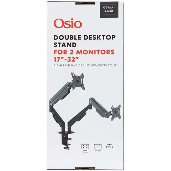 Η διπλή βάση στήριξης γραφείου OSMA-4638 είναι η ιδανική λύση για την τοποθέτηση δύο οθονών υπολογιστή, προσφέροντας εργονομία και ευελιξία. Είναι σχεδιασμένη για οθόνες διαστάσεων 17 έως 32 ίντσες, με μέγιστο βάρος 10 κιλά, ενώ διαθέτει πρότυπο VESA 100x100 για εύκολη και ασφαλή στερέωση. Το μέγιστο ύψος της βάσης φτάνει τα 515 χιλιοστά, παρέχοντας τη δυνατότητα ρύθμισης για άνετη χρήση και σωστή στάση σώματος. Η κατασκευή της είναι στιβαρή και αξιόπιστη, εξασφαλίζοντας σταθερότητα κατά τη διάρκεια της χρήσης. Περιλαμβάνεται πλήρες σετ στερέωσης που σας επιτρέπει να τοποθετήσετε τη βάση εύκολα και γρήγορα τόσο στο γραφείο όσο και στις οθόνες σας. Αυτή η βάση είναι η ιδανική επιλογή για να οργανώσετε τον χώρο εργασίας σας και να απολαύσετε μέγιστη λειτουργικότητα. - Διπλή βάση στήριξης γραφείου για 2 οθόνες υπολογιστή