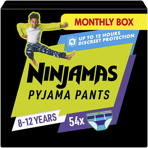 Πάνες Βρακάκι Νυκτός NINJAMAS για Αγόρια από 8-12 ετών. Καταπολεμήστε τα ατυχήματα νυκτερινής ενούρησης και αφήστε το παιδί σας να ξυπνήσει με αυτοπεποίθηση χάρη στις πάνες-βρακάκι για τη νύχτα Ninjama Pyjama. Διαθέτει τεχνολογία άμεσης απορρόφησης που απορροφά την υγρασία στην στιγμή για ισχυρή προστασία και στεγνότητα. Η ελαστική ζώνη 360 μοιρών που ακολουθεί τη φόρμα του σώματος λυγίζει και τεντώνεται, για να ταιριάζει καλύτερα στα μεγαλύτερα παιδιά, όπως συμβαίνει με τα κανονικά εσώρουχα. Το υλικό QuietCloth ελαχιστοποιεί τον θόρυβο για διακριτική εμπειρία. Δερματολογικά ελεγμένες.