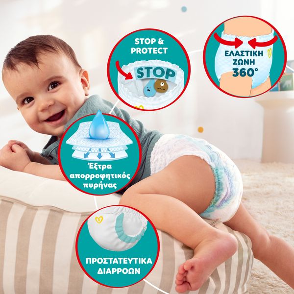 Το προϊόν εμπίπτει στην κατηγορία μηδενικού Φ.Π.Α σύμφωνα με το διάταγμα (ΚΔΠ 349/2024) από 4 Νοεμβρίου 2024 μέχρι 31 Δεκεμβρίου 2025.     Όταν το μωρό αρχίζει να γίνεται πιο δραστήριο, η αλλαγή της πάνας μπορεί να γίνει πολύ δύσκολη. Έφτασε η στιγμή για τις πάνες-βρακάκι Pampers Pants. Οι πάνες-βρακάκι Pampers Pants φοριούνται εύκολα με μία κίνηση και προσφέρουν έως και 12 ώρες στεγνότητας.   Η τέλεια εφαρμογή τους προσαρμόζεται σε κάθε κίνηση του μωρού, για να προσφέρει άνεση και προστασία. Χάρη στα 3 απορροφητικά κανάλια τους, βοηθούν στην ομοιόμορφη κατανομή της υγρασίας, μειώνοντας τα υγρά* και εγκλωβίζοντάς την στο εσωτερικό της πάνας κρατώντας το μωρό σας στεγνό. Κάντε την αλλαγή της πάνας γρήγορη και εύκολη υπόθεση, όπου κι αν πηγαίνει το μωρό, με τις πάνες-βρακάκι Pampers Pants.   *Σε σχέση με τις προηγούμενες πάνες-βρακάκι της Pampers.