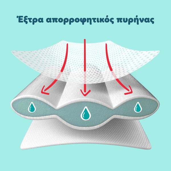 - Τριπλή Απορροφητικότητα: Τρία κανάλια συγκρατούν και κατανέμουν την υγρασία για απόλυτη προστασία.