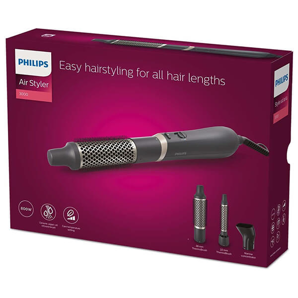 Ηλεκτρική βούρτσα με αέρα για ίσιωμα και μπούκλες. Η βούρτσα διαθέτει δύο διαφορετικές διαμέτρους, τόσο για μακριά όσο και για κοντά μαλλιά. -Η μεγάλη διάμετρος των 38 mm είναι ιδανική τόσο για ίσιωμα μαλλιών όσο και για δημιουργία κυματιστού στυλ. -Η διάμετρος των 22mm είναι ιδανική για styling και δημιουργία μπούκλας. -Διαθέτει 3 ρυθμίσεις θερμότητας και 2 ρυθμίσεις ταχύτητας. Επιλέξτε μεταξύ χαμηλής και υψηλής ταχύτητας με 3 ρυθμίσεις: δροσερή, απαλή και υψηλή θερμοκρασία. -Η ευελιξία της ρύθμισης παρέχει ισχυρή ροή αέρα και απαλό έλεγχο θερμοκρασίας για να επιτύχετε τα επιθυμητά αποτελέσματα στυλ. -Χρησιμοποιεί χαμηλή θερμοκρασία για να στεγνώσει απαλά τα μαλλιά σας. Ιδιαίτερα αποτελεσματικό για το στέγνωμα εύθραυστων, ξηρών ή κατεστραμμένων μαλλιών. -Η λειτουργία Care εξασφαλίζει τη βέλτιστη θερμοκρασία στεγνώματος και αποτρέπει την υπερθέρμανση. Η ισχύς της ροής του αέρα και η ταχύτητα στεγνώματος δεν αλλάζουν, αλλά το styling πραγματοποιείται σε μια σταθερή θερμοκρασία που είναι βέλτιστη για τα μαλλιά. -Διαθέτει κεραμικές βούρτσες με έλαιο argan για να κάνει το styling πιο γρήγορο και ευκολότερο, ενώ παρέχει άνετη ολίσθηση για μεταξένια μαλλιά. Χαρακτηριστικά Εξαρτήματα: ThermoBrush 22mm, Round brush 38 mm, στενό στόμιο.Ταχύτητες: 2.Επίπεδα θερμότητας: 3.Ισχύς: 800 W.Μήκος καλωδίου: 1.8 m.Τύπος καλωδίου: 360° swivel cord.Χαρακτηριστικά: ψυχρός αέρας, γάντζος κρεμάσματος.Χρώμα: Γκρι.Εγγύηση: 2 χρόνια.