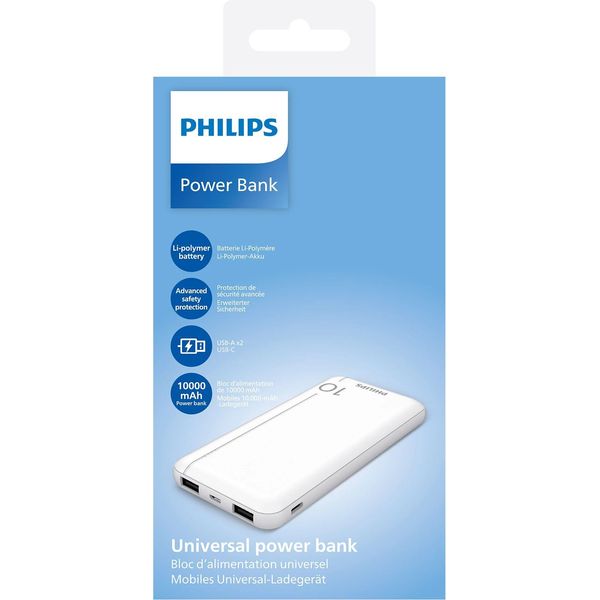 Το Philips DLP1810CW/00 είναι ένα λεπτό και ισχυρό power bank χωρητικότητας 10.000 mAh, σχεδιασμένο για να κρατά τις συσκευές σου ενεργές όλη μέρα. Διαθέτει τρεις θύρες εξόδου (2?USB-A & 1?USB-C) για ταυτόχρονη φόρτιση έως 3 συσκευών, ενδεικτική λυχνία LED λειτουργίας και έξυπνες προστασίες κατά υπερθέρμανσης, υπέρτασης και υπερέντασης. Ελαφρύ και κομψό σε άσπρο χρώμα, χωράει εύκολα σε τσάντα ή τσέπη. - Χωρητικότητα: 10.000 mAh / 37 Wh