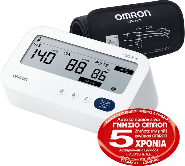 OMRON στην κατηγορία ΠΙΕΣΟΜΕΤΡΑ Το OMRON M3 Comfort AFib (HEM-7196-FLE) είναι πιεσόμετρο μπράτσου νέας γενιάς με δυνατότητα ανίχνευσης κολπικής μαρμαρυγής, σχεδιασμένο για αξιόπιστη και εύκολη παρακολούθηση της αρτηριακής πίεσης στο σπίτι. Είναι κλινικώς πιστοποιημένο από την Ευρωπαϊκή Εταιρεία Υπέρτασης και συμβάλλει στη μείωση του κινδύνου εγκεφαλικού έως και 66% χάρη στην έγκαιρη ανίχνευση AFib με την τεχνολογία Intellisense AFib. Ιδανικό για καθημερινή χρήση, προσφέρει ακρίβεια, άνεση και ασφάλεια για όλη την οικογένεια.