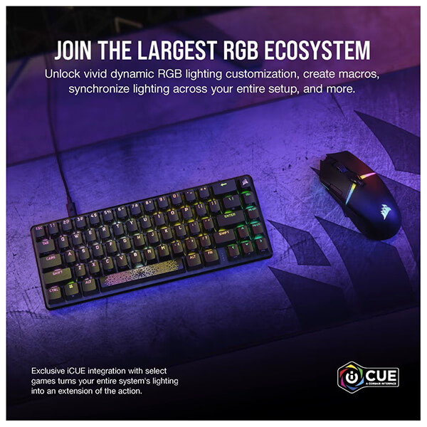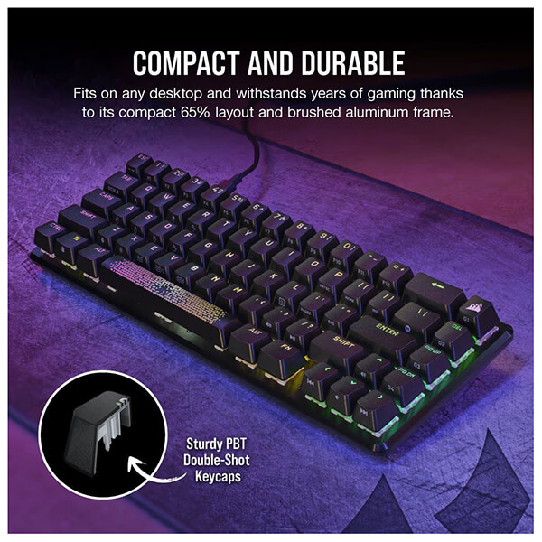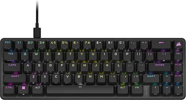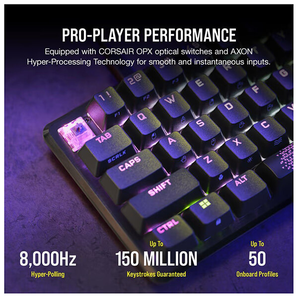Gaming πληκτρολόγιο της Corsair σε μέγεθος 65% που εξοικονομεί χώρο. Οι οπτικοί διακόπτες CORSAIR OPX συνδυάζονται με ικανοποιητική ακουστική για να εστιάσετε σε αυτό που πραγματικά έχει σημασία: το παιχνίδι. -65% σχήμα, 100% απόδοση. Περιλαμβάνει τα πολύ σημαντικά βέλη και τα βοηθητικά πλήκτρα, ενώ αφήνει άφθονο χώρο στο γραφείο για σαρωτικές κινήσεις του ποντικιού. -Τα πλήκτρα έχουν δευτερεύουσες λειτουργίες κάτι που σας δίνει τη δυνατότητα να εκτελείτε εργασίες με ευκολία. -Το αποσπώμενο καλώδιο USB Type-C σάς επιτρέπει να αλλάζετε το πληκτρολόγιό σας αμέσως ή να το αποσυνδέετε για να το μεταφέρετε οπουδήποτε. -Οι οπτικο-μηχανικοί διακόπτες CORSAIR OPX προσφέρουν απίστευτα ομαλή, γραμμική, εξαιρετικά γρήγορη πληκτρολόγηση. -Το CORSAIR AXON έχει απόκριση έως και 8 φορές πιο γρήγορα, με τον πιο περίπλοκο φωτισμό RGB. -Αποθηκεύστε έως και 50 προφίλ προσαρμοσμένων ρυθμίσεων, πλήκτρων μακροεντολής και RGB με 8 MB ενσωματωμένης αποθήκευσης. -Δύο στρώματα απόσβεσης ήχου αμβλύνουν τους ήχους του πληκτρολογίου για φανταστική ακουστική πληκτρολόγηση. -Τα στιβαρά πλήκτρα αντέχουν στο πιο έντονο παιχνίδι χωρίς να υφίστανται φθορά. Χαρακτηριστικά Τύπος: Opto-Mechanical.Μέγεθος: 65%.Διακόπτες: CORSAIR OPX.Φωτισμός: ARGB LED.Keyboard Report Rate: έως 8.000Hz.Αριθμός πλήκτρων: 67.Keyboard Rollover: Full Key (NKRO) with 100% Anti-Ghosting.On-Board Memory: 8MB.Onboard profiles: έως 50.Media and Volume Controls: FN Shortcuts.Διασύνδεση: USB 3.0 or 3.1 Type-A.Μήκος καλωδίου: 1.82 m.Επιπλέον χαρακτηριστικά: Προσαρμόσιμος φωτισμός, Ρυθμιζόμενο ύψος, Μακροεντολές.Βάρος: 0.8 kg.Χρώμα: Μαύρο.Εγγύηση: 2 χρόνια. DOA 7 ημερών