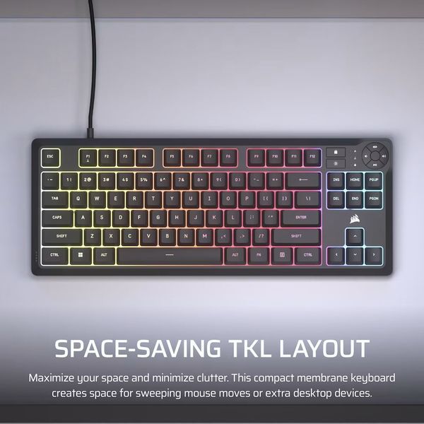 Τύπος: Gaming πληκτρολόγιο με μεμβρανικούς διακόπτες. Διάταξη: Tenkeyless (χωρίς αριθμητικό). Φωτισμός: RGB με υποστήριξη CORSAIR iCUE. Ρυθμός απόκρισης: 1000Hz. Key Rollover: 12-Key Selective (12KRO). Αντοχή σε υγρά: Έως 300ml. Συνδεσιμότητα: Ενσύρματο μέσω USB 2.0 Type-A. Έλεγχος media: Αφιερωμένα πλήκτρα media & volume. WIN Lock: Πλήκτρο αποκλεισμού για αποφυγή ατυχημάτων. Μνήμη: Ενσωματωμένη για αποθήκευση ρυθμίσεων. Συμβατότητα: Windows 10, macOS 10.15. Βάρος: 0.843 kg. Χρώμα: RGB Black. Εγγύηση: 2 Χρόνια. DOA 7 ημερών