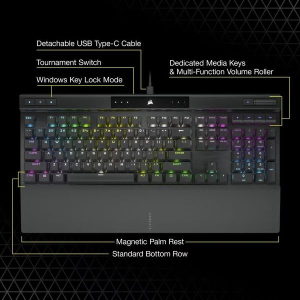 Διαστάσεις: 444mm x 166mm x 40mm Βάρος: 1.72 kg Διακόπτες: CHERRY MX SPEED / CORSAIR OPX (ανάλογα με επιλογή) Φωτισμός: RGB ανά πλήκτρο Polling Rate: έως 8,000Hz Key Rollover: Full Key (NKRO) με 100% Anti-Ghosting Πλήκτρα πολυμέσων: Dedicated Hotkeys, Volume Roller Ρυθμιζόμενο ύψος: Ναι Σύνδεση: USB 3.0 ή 3.1 Type-A (ενσύρματη) Wrist Rest: Ναι, ενσωματωμένο Αντοχή πλήκτρων: έως 100 εκατ. πατήματα Μνήμη Onboard: 8MB, έως 50 προφίλ Συμβατότητα: PC, Mac, Xbox One με USB 3.0/3.1, Windows 10 ή macOS 10.15+ Εγγύηση: 2 Χρόνια. DOA 7 ημερών