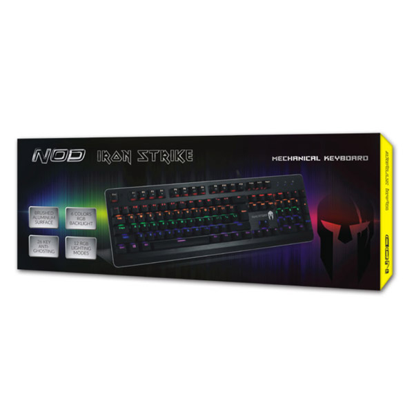 Ενσύρματο μηχανικό gaming πληκτρολόγιο, με backlight RGB LED φωτισμό 6 χρωμάτων και επιφάνεια από αλουμίνιο σε μαύρο χρώμα. Η pure gaming εμφάνιση του μηχανικού NOD IRON STRIKE, θα σας κερδίσει με την πρώτη ματιά. Επιφάνεια από μαύρο αλουμίνιο, με εντυπωσιακό ασημί περίγραμμα, φωτιζόμενα μηχανικά πλήκτρα με επιλογή μεταξύ 12 RGB μοτίβα φωτισμού, blue switch keys για άμεση απόκριση στις εντολές σας αλλά και "πορωτικό" gaming ήχο. Yφασμάτινο "braided" καλώδιο σύνδεσης USB σε μαύρο stealth χρώμα, για επιπλέον αντοχή στην χρήση και για άρτιο αισθητικό αποτέλεσμα. Με λειτουργία Anti-Ghosting μέχρι και 26 πλήκτρα, σας καλύπτει σε κάθε πεδίο μάχης. Μεγάλο ατού, αποτελεί το γεγονός ότι πρόκειται για ένα full size πληκτρολόγιο με αριθμητικά πλήκτρα, αλλά και 11 πλήκτρα multimedia, επεκτείνοντας την ευχρηστία του και πέρα από το gaming. Χαρακτηριστικά: - Xinda blue switch πλήκτρα. - Ρυθμιζόμενος φωτισμός με 6 RGB χρώματα. - Anti-Ghosting μέχρι και 26 πλήκτρα. - 11 πλήκτρα multimedia. - 12 RGB μοτίβα φωτισμού. - US international layout. - Χρόνος Ζωής: 20 εκατομμύρια πατήματα. Τύπος σύνδεσης: USB 2.0.Καλώδιο: Braided 1.5m.Αριθμός πλήκτρων: 104.Χρώμα: Μαύρο.Εγγύηση: 2 χρόνια. DOA 7 ημερών