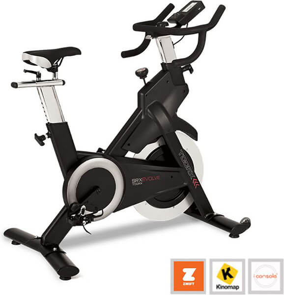 Ποδήλατο Spin Bike SRX Evolve HRC TOORX. -Μετάδοση κίνησης μέσω δίσκου με επιμήκη ιμάντα. -Σύστημα αντίστασης: Mαγνητικό ελεγχόμενο από ηλεκτρικό μοτέρ 24 επιπέδων. -Εξοπλισμένο με μοχλό ασφαλείας για άμεσο φρενάρισμα του τροχού. Βάρος τροχού: 22 kg.Μέγιστο βάρος χρήστη: 150 kg.Θέση σέλας: δίχρωμη σέλα με κάθετη και μικρομετρική οριζόντια ρύθμιση.Τιμόνι: κάθετη και μικρομετρική οριζόντια ρύθμιση.Μανιβέλα πεντάλ: 3 κομμάτια.Πεντάλ: SPD.Ροδάκια μεταφοράς: Ναι.Κονσόλα: οθόνη LCD με μπλε φωτισμό, βάση για tablet/ smartphone.Ενδείξεις: απόσταση, χρόνος, θερμίδες, παλμοί, ταχύτητα, RPM, επίπεδο έντασης.Προγράμματα: 1 manual, 12 προκαθορισμένα προγράμματα, 4 HRC.Μέτρηση καρδιακού παλμού: ενσωματωμένος ασύρματος δέκτης καρδιακών παλμών. Περιλαμβάνεται συσκευή μέτρησης καρδιακών παλμών.App Ready 3.0: Ενσωματωμένο έξυπνο σύστημα Bluetooth που επιτρέπει τη σύνδεση του ποδήλατού σας με τις πιο ελκυστικές εφαρμογές που είναι ειδικά σχεδιασμένες για προπόνηση σε ποδήλατα. Περιλαμβάνει iConsole+ Training..Συμβατό με εφαρμογές: Zwift App (απαιτείται συνδρομή) και Kinomap App (απαιτείται συνδρομή).Βάρος: 43,5 kg.Διαστάσεις όταν στηθεί: 126 X 62 X 119 cm.Πιστοποιήσεις: CE-ROHS-EN957.Εγγύηση: 2 χρόνια. DOA 7 ημερών