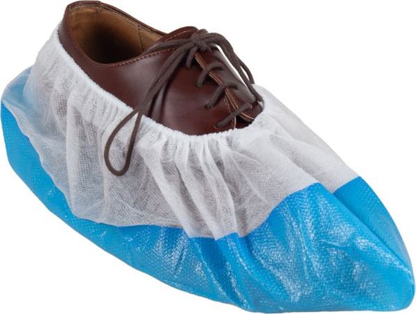 Λευκά-Μπλε ποδονάρια μίας χρήσης, με αντιολισθητική σόλα, από χλωριωμένο πολυαιθυλένιο και πολυπροπυλένιο.