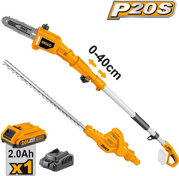 Πολυμηχάνημα 2 σε 1 Μπαταρίας 20V Li-Ion. -Τέντωμα αλυσίδας. -Αυτόματη λίπανση. -Led ένδειξη κατάστασης μπαταρίας. -7 Θέσεις περιστροφικής κεφαλής έως και 90 μοιρών. -Μαχαίρια από ειδικό ατσάλι κομμένα με Laser και τροχισμένα με διαμάντι. Χαρακτηριστικά Τάση: 20V.Ταχύτητα αλυσίδας: 4.8m/s.Μέγεθος λάμας (Αλυσοπρίονο): 8'' / 200mm.Χωρητικότητα δεξαμενής: 70ml.Tαχύτητα χωρίς φορτίο (Μπορντουροψάλιδο): 2800rpm.Μήκος λάμας (Μπορντουροψάλιδο): 1'' / 450mm.Δυνατότητα κοπής λάμας: έως 18mm.Κοντάρι: Τηλεσκοπικό κοντάρι με συνολικό ολικό μήκος 1.96m.Τηλεσκοπική προέκταση: +40cm.Περιεχόμενα συσκευασίας: 1 τεμ. Φορτιστή 1 ώρας, 1 τεμ. Μπαταρία 20V 2.0Ah Li-Ion, 1 τεμ. Αλυσοπρίονο κεφαλή, 1 τεμ. Μπορντουροψάλιδο κεφαλή.Βάρος: 8.50 Kg.Εγγύηση: 2 χρόνια.