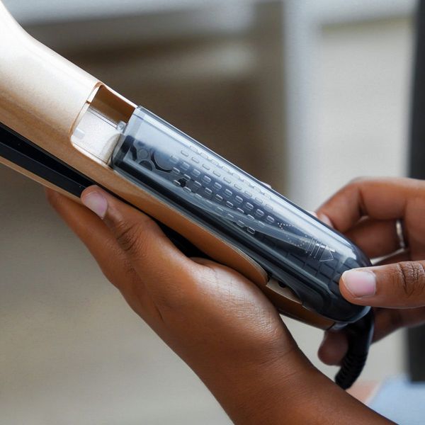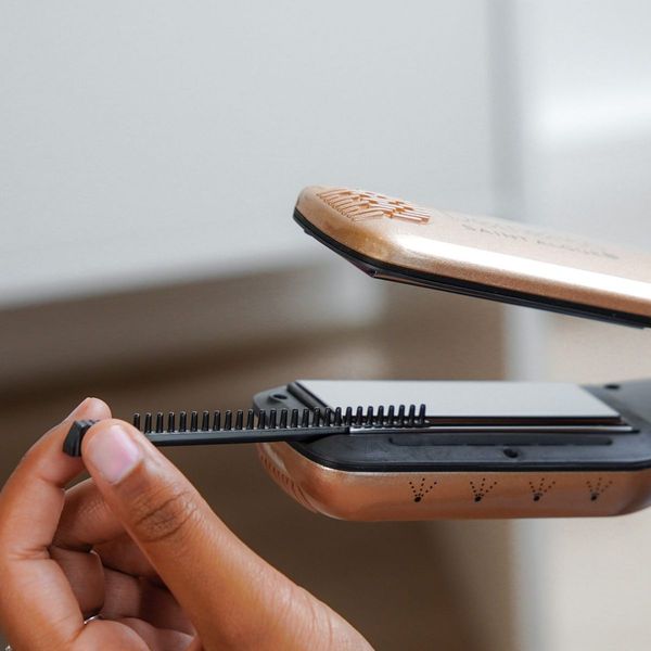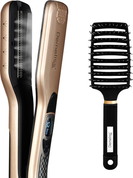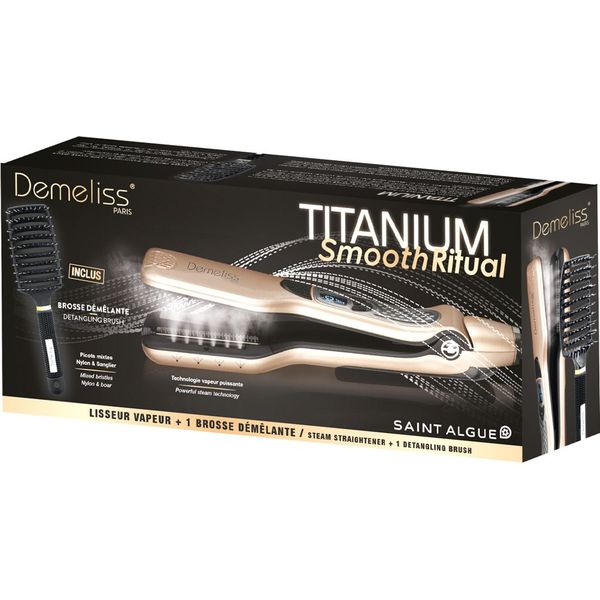 Ψηφιακή πρέσα μαλλιών με ατμό και πλάκες τιτανίου Titanium Smooth Ritual DEMELISS! Διαθέτει φαρδιές πλάκες με επίστρωση τιτανίου, σύστημα γρήγορης θέρμανσης με ρύθμιση θερμοκρασίας από 150?C έως 230?C, και αποσπώμενη χτένα για γρήγορη, σταθερή απόδοση και επαγγελματικά αποτελέσματα. Είναι ιδανική για την φροντίδα όλων των τύπων μαλλιών καθώς ο ατμός θα τιθασεύσει εύκολα και τις πιο δύσκολες τρίχες, ενώ εγγυάται λαμπερά μαλλιά και ολοκληρωμένη προστασία. Διαθέτει σύστημα ανάρτησης, με αποτέλεσμα οι θερμαινόμενες επιφάνειες να εφαρμόζουν άψογα σε οποιοδήποτε τύπο και όγκο μαλλιού, αντιθερμικές άκρες για πλήρη προστασία κατά τη διάρκεια του styling και οθόνη LCD με ευανάγνωστες ενδείξεις θερμοκρασίας. Περιλαμβάνει εργονομική βούρτσα που εξασφαλίζει απαλό ξεμπέρδεμα χωρίς τράβηγμα ή σπάσιμο της τρίχας, ενώ χάρη στις ακίδες διαφορετικού μεγέθους διευκολύνει το styling για λαμπερά και πλούσια μαλλιά.