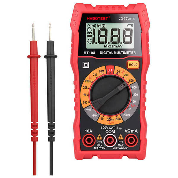 Ψηφιακό Universal Πολύμετρο Habotest HT108L. -Το ψηφιακό πολύμετρο Habotest HT108L είναι μια πολυλειτουργική συσκευή που θα αποδειχθεί χρήσιμη κατά τις ηλεκτρολογικές εργασίες. Το προϊόν σάς επιτρέπει να μετράτε την τάση, την αντίσταση και πολλές άλλες τιμές. -Το πολύμετρο διαθέτει μια ευανάγνωστη οθόνη που σας επιτρέπει να διαβάζετε εύκολα τα αποτελέσματα της μέτρησης, επιπλέον, είναι εξοπλισμένο με φακό και πρακτικά κουμπιά. -Το μικρό μέγεθος της συσκευής (130 x 70 x 23 mm) κάνει το πολύμετρο να εφαρμόζει καλά στο χέρι και παρέχει υψηλή άνεση στη χρήση. -Τροφοδοτείται από δύο μπαταρίες AAA, τις οποίες μπορείτε εύκολα να αφαιρέσετε και να αντικαταστήσετε. -Το περίβλημα από μαλακό υλικό είναι ευχάριστο στην αφή, παρέχει αποτελεσματική μόνωση και είναι ανθεκτικό στις πτώσεις. Χαρακτηριστικά Εύρος μέτρησης τάσης DC: 200mV/2V/20V/200V/600V.Εύρος μέτρησης τάσης AC: 20V/200V/600V.Εύρος μέτρησης ρεύματος DC: 20mA/200mA.Εύρος μέτρησης αντίστασης: 200Ω/2kΩ/20kΩ/200kΩ/2MΩ/20MΩ.Θερμοκρασία λειτουργίας: 0? - 40?.Οθόνη: 2000 μετρήσεις.Δοκιμή διόδου: Ναι.Οπίσθιος φωτισμός: Ναι.Αυτόματη απενεργοποίηση: Ναι.Τροφοδοσία: 2 X 1.5V AAA.Χρώμα: Πορτοκαλί.Βάρος: 0.105 Kg.Διαστάσεις: 124 X 65 X 35mm.Εγγύηση: 2 χρόνια.