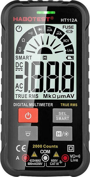 Το πολύμετρο HT112A είναι εξοπλισμένο με μεγάλη οθόνη και κουμπιά σιλικόνης και εύκολο και άνετο στη χρήση. -Παρέχει ακριβή μέτρηση διαφόρων παραμέτρων. Διαθέτει φακό LED και για την τροφοδοσία του απαιτεί 2 μπαταρίες CR2032 3V. -Το πάχος του είναι μόνο 1.9 εκατοστά και η ευανάγνωστη οθόνη θα σας παρέχει εύκολη πρόσβαση σε όλες τις σημαντικές πληροφορίες. Μεγάλα κουμπιά σιλικόνης διευκολύνουν τη χρήση της συσκευής. -Το πολύμετρο HT112A μετρά με ακρίβεια την τάση AC και DC, αναγνωρίζει τη δραστηριότητα των καλωδίων, και επιτρέπει την δοκιμή διόδων. Επίσης μπορείτε να ελέγξετε τη συνέχεια και την πραγματική τιμή RMS και να κάνετε ανίχνευση τάσης χωρίς επαφή (NCV). Χαρακτηριστικά Εύρος μέτρησης τάσης DC: 2V/30V/200V/600V ±(0.5%+3).Εύρος μέτρησης τάσης AC: 2V/30V/200V/600V ±(1.0%+3).Εύρος μέτρησης ρεύματος DC: 20mA/200mA/600mA ±(1.2%+5).Εύρος μέτρησης ρεύματος AC: 20mA/200mA/600mA ±(1.5%+5)Εύρος μέτρησης αντίστασης: 200?/2k?/20k?/200k?/2M?/20M? ±(1.0%+5).Μετρήσεις: 2000.Τροφοδοσία: 2x CR2032 3V μπαταρίες.Αλλα χαρακτηριστικά: δοκιμή διόδων, NCV, True RMS, αποθήκευση δεδομένων, ένδειξη χαμηλής μπαταρίας, οπίσθιος φωτισμός, φακός, αυτόματο κλείσιμο.Εγγύηση: 2 χρόνια.