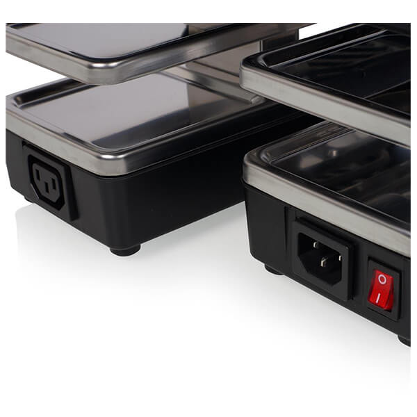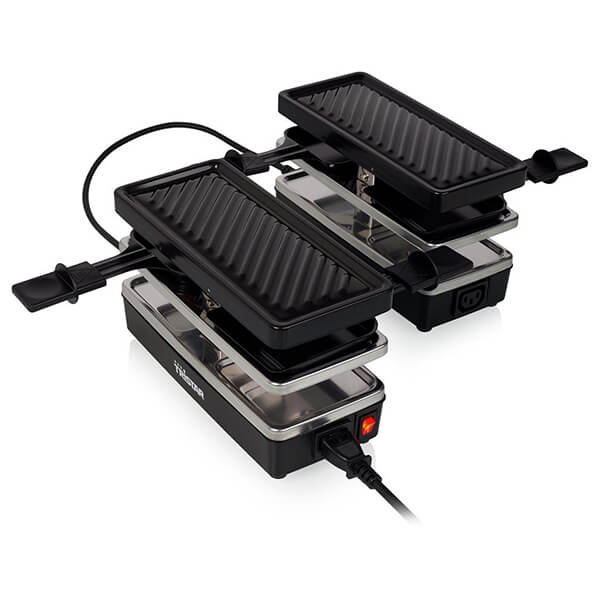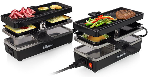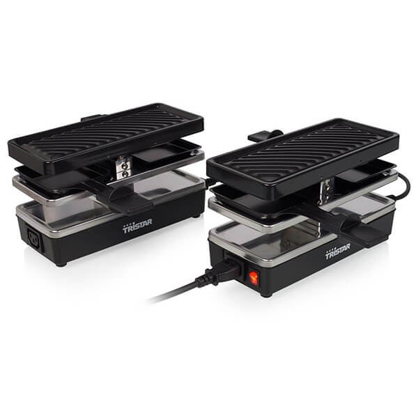 Επιτραπέζια ψησταριά Tristar με μέγιστη ισχύ 800W για ψήσιμο φαγητών όπως το ψάρι, το κρέας και τα λαχανικά. -Eίναι κατάλληλη για 4 άτομα, αλλά χάρη στα παρεχόμενα καλώδια, μπορούν να συνδεθούν επιπλέον 3 σετ, και έτσι να είναι επεκτάσιμη για έως και 10 άτομα. -Διαθέτει πλάκα γκριλ με αντικολλητική επίστρωση για να μπορείτε να ψήσετε εύκολα. -Μπορείτε να τη μετακινήσετε εύκολα χάρη στις ενσωματωμένες λαβές, ενώ τα αντιολισθητικά πόδια διασφαλίζουν ότι παραμένει σταθερό στο τραπέζι. -Καταλαμβάνει λίγο χώρο και το μικρό της βάρος σημαίνει ότι μπορείτε να την πάρετε εύκολα μαζί σας. Χαρακτηριστικά Ισχύς: 2x 400 W.Διαστάσεις επιφανειών ψησίματος: 2x 23.8 x 10.4 cm.Μέγιστη θερμοκρασία: 220 °C.Μήκος καλωδίου: 0.7 m.Τάση: 230 V.Περιεχόμενα: 4x τηγάνια, αφαιρούμενη πλάκα γκριλ, 4 ξύλινες σπάτουλες, οδηγίες.Εγγύηση: 2 χρόνια.