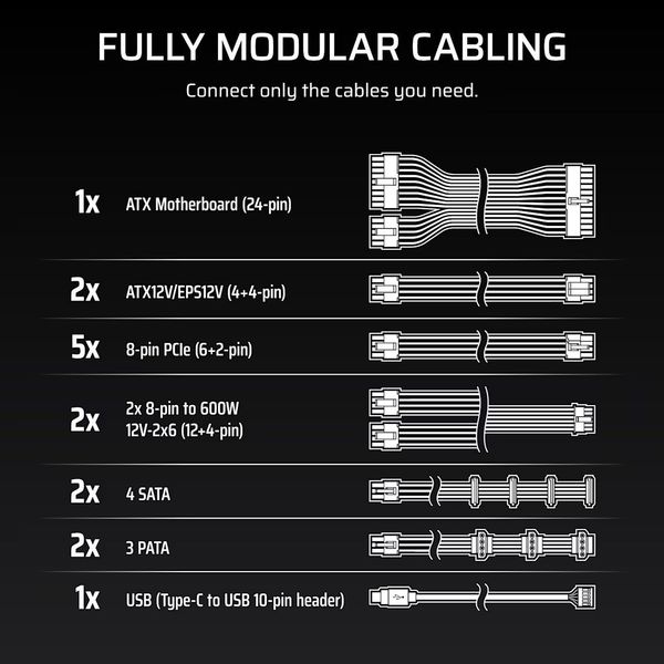 - Καλώδια: 8x SATA, 6x PATA, 5x PCIe (6+2), 2x EPS (4+4), 1x 24-Pin.