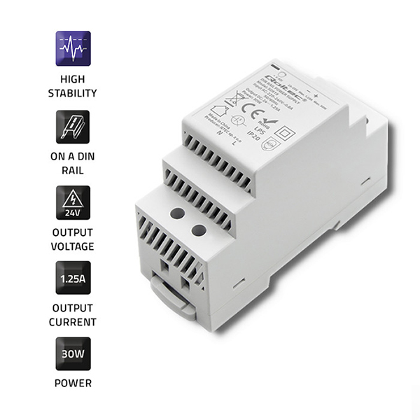 Τα τροφοδοτικά DIN Rail είναι βιομηχανικά τροφοδοτικά τα οποία, εκτός από επαρκώς υψηλό βαθμό προστασίας που εξασφαλίζει προστασία από εξωτερικές συνθήκες, έχουν επίσης παραμέτρους υψηλής ισχύος και απόδοσης. Εύρος ρύθμισης τάσης εισόδου: 23-25 V dc.Ωφέλιμη ισχύς: 30 W.Τάση εισόδου: 220 - 240 V.Συχνότητα: 50 - 60 Hz.Ρεύμα εξόδου: 1.25 A.Τάση εξόδου: 24 V.Ασφάλεια: Overvoltage protection, overload protection, short-circuit protection.Αποδοτικότητα: 86%.Αδιαβροχοποίηση: IP 20.Πιστοποιήσεις: CE.Διαστάσεις: 93 x 58 x 35 mm.Χρώμα: Γκρί.Εγγύηση: 2 χρόνια. DOA 7 ημερών