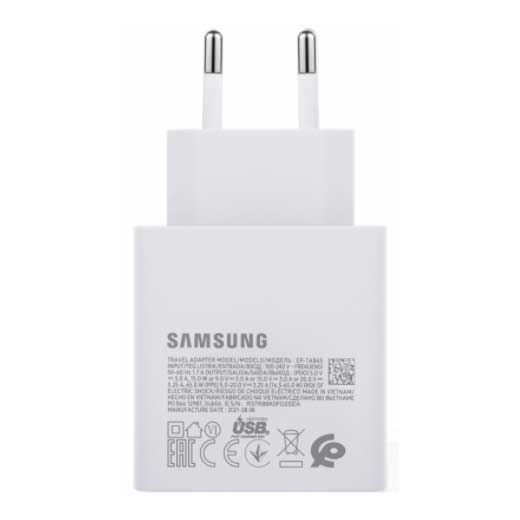 Αντάπτορας φόρτισης Samsung. Υποστηρίζει γρήγορη φόρτιση, η οποία θα πρέπει να είναι συμβατή με το κινητό σας. Σε αντίθετη περίπτωση, το κινητό σας θα φορτίσει όπως με έναν συμβατικό φορτιστή. Δεν περιλαμβάνεται καλώδιο σύνδεσης. Χαρακτηριστικά Θύρα Εξόδου: USB-C.Ένταση Ρεύματος (Max): 3A.Ισχύς: 65W.Χρώμα: Λευκό.Εγγύηση: 2 χρόνια. DOA 7 ημερών
