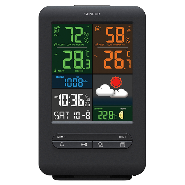 Μετεωρολογικός σταθμός Sencor. -Πρόγνωση καιρού με εικονίδια (Αίθριος, ελαφρά νεφελώδης, νεφοσκεπής, βροχερός, χιονόπτωση). -Ένδειξη εσωτερικής και εξωτερικής θερμοκρασίας και υγρασίας με εμφάνιση τάσεων. -Βαρομετρική πίεση σε σχετικές ή απόλυτες ενδείξεις. -Δείκτης καιρού για εξωτερικό χώρο Σημείο Δρόσου και Δείκτης Θερμότητας. -Μνήμη Μέγ./Ελάχ. τιμών με χρονοσήμανση ώρας-ημερομηνίας - Καταγραφή τελευταίων 24 ωρών. -Ένδειξη θερμοκρασίας με επιλογή μονάδας °C / °F. -Ρύθμιση υψηλού / χαμηλού ορίου ειδοποίησης (εσωτερική / εξωτερική θερμοκρασία και υγρασία). -Αναβοσβήσιμο ένδειξης για ειδοποίηση υψηλού/χαμηλού ορίου. -Ένδειξη Ώρας, Ημερολογίου, Ημέρας εβδομάδας και Φάσης σελήνης. -Ειδοποίηση παγετού και επίπεδο άνεσης. -Ραδιο-ελεγχόμενη ώρα και ώρα μέσω σήματος DCF77, με ενημέρωση θερινής ώρας (χειροκίνητη ρύθμιση εφικτή). -Ημερομηνία και ημέρα εβδομάδας (ημέρα εβδομάδας σε 7 γλώσσες: EN / IT / ES / DE / FR / NL / RU). -Οθόνη με διαγώνιο 5,4" (13,8 cm). -3 Επίπεδα φωτεινότητας οθόνης: Υψηλή / Χαμηλή / Αυτόματη. -Ηλιακό πάνελ για αυτόματη προσαρμογή του οπίσθιου φωτισμού. -Τοποθέτηση σε σε γραφείο ή τοίχο. -1 αισθητήρας περιλαμβάνεται (SWS TH8700-8800-7300). -Μετάδοση έως 30 m μεταξύ κύριας μονάδας και αισθητήρα (σε ανοικτή περιοχή). Εύρος θερμοκρασίας εσωτερικού χώρου: -5°C έως +50°C.Εύρος θερμοκρασίας εξωτερικού χώρου: - 40°C έως +60°C.Εύρος υγρασίας εσωτερικού και εξωτερικού χώρου: 1% έως 99% RH.Συχνότητα εκπομπής αισθητήρα: 433 MHz.Αντάπτορας ρεύματος κύριας μονάδας: DC 5 V / 1000 mA (συμπεριλαμβάνεται).Εφεδρική μπαταρία κύριας μονάδας: 1 x CR-2032 3 V (συμπεριλαμβάνεται).Τροφοδοσία αισθητήρα: 2 μπαταρίες 1,5 V τύπου AAΑ.Διαστάσεις κύριας μονάδας: (Π/Υ/Β) 11.8 x 19.25 x 2.1 cm.Βάρος κύριας μονάδας: 280 g.Χρώμα: Μαύρο.Εγγύηση: 2 χρόνια. DOA 7 ημερών