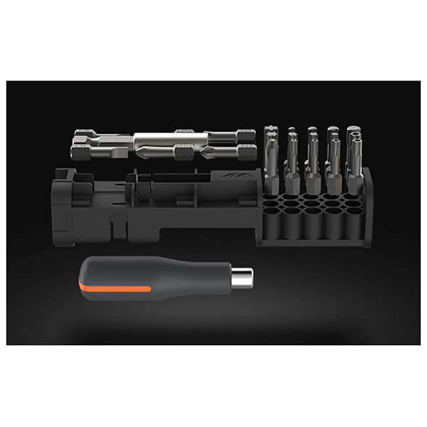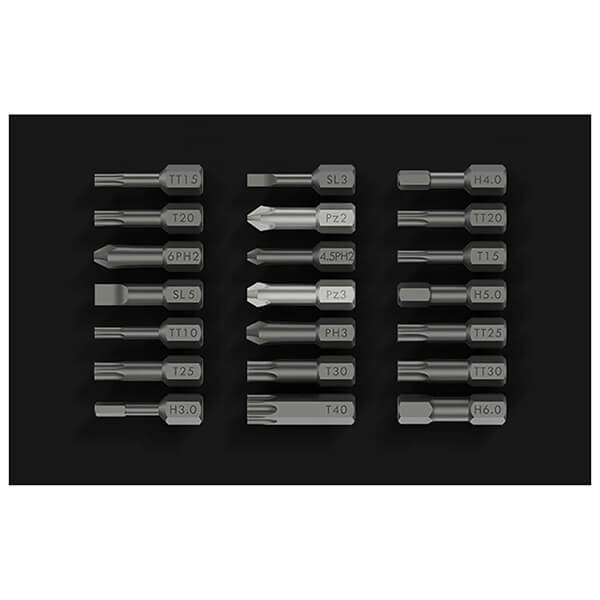 Το σετ κατσαβιδιών ακριβείας JAM-GNT23 23 τεμαχίων, τοποθετημένο σε ένα μικρό και εύχρηστο κουτί με βολικό κλείσιμο, θα γίνει απαραίτητο βοήθημα για όλες τις μικρές επισκευές, είτε στο σπίτι, στο συνεργείο ή στη δουλειά. -Κάθε κομμάτι έχει τη δική θέση στη θήκη ενώ το μαγνητικό περίβλημα συγκρατεί τα εργαλεία στη θέση τους. -Η λαβή του κατσαβιδιού έχει διαμορφωθεί με ακρίβεια για να ταιριάζει στο χέρι σας ενώ οι μύτες έχουν μαγνήτη για να εμποδίζουν τις βίδες να γλιστρούν όταν τις βιδώνετε. -Το σετ περιλαμβάνει επίσης μια προέκταση για το κατσαβίδι, η οποία σας επιτρέπει να σφίγγετε τις βίδες ακόμα και σε δυσπρόσιτα σημεία. Η προέκταση είναι επίσης μαγνητισμένη για να μην πέφτουν τα κομμάτια ενώ εργάζεστε. -Οι μύτες έχουν σκληρότητα HRC6 και εξυπηρετούν τα πιο κοινά είδη βιδών. Χαρακτηριστικά • Μέγεθος κατσαβιδιού: 8cm. • Υλικό λαβής: PP+TPE. • Μύτες κατσαβιδιού: 4.5PH2, 6PH2, 3PH1, TT30, TT20, TT25, TT15, TT10, T30, T25, T20, T15, T40, H6, H5, H5, H3, PZ2, PZ3, SL5, SL3. • Υλικό μυτών: S2 Alloy Steel. • Διαστάσεις εξοπλισμού: 155 x 35 x 35 mm. • Βάρος: 300g. • Εγγύηση: 1 χρόνος.