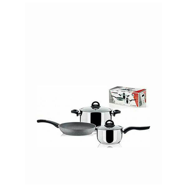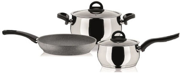 Σετ 3 μαγειρικών σκευών με 2 καπάκια, από ανοξείδωτο ατσάλι.