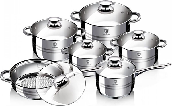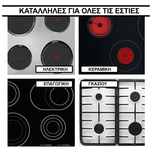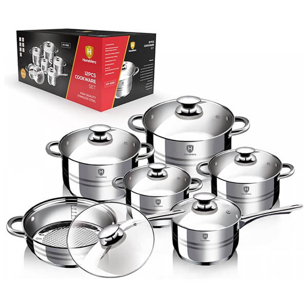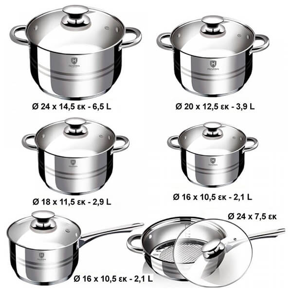 Το Σετ Μαγειρικών Σκευών από Ανοξείδωτο Ατσάλι HV-1012 της HomeVero θα εξασφαλίσει μακροχρόνια, ποιοτική χρήση και δεν πρόκειται να σας απογοητεύσει. -Αποτελεί την καλύτερη επένδυση στην κουζίνα σας, αφού το σετ περιλαμβάνει ό,τι θα χρειαστείτε για την καθημερινή προετοιμασία των γευμάτων σας. -Τα σκεύη είναι κατασκευασμένα από υψηλής ποιότητας ανοξείδωτο ατσάλι, γεγονός που προσδίδει ασυναγώνιστη κομψότητα και ταχεία, ομοιόμορφη κατανομή θερμότητας. -Ο ειδικός επαγωγικός πάτος 5 στρωμάτων εγγυάται γρήγορη και ομοιόμορφη κατανομή θερμότητας και οικονομία έως και 35% στην κατανάλωση ρεύματος. -Οι κατσαρόλες διαθέτουν γυάλινα καπάκια, κάτι που σας επιτρέπει να ελέγχετε ανεμπόδιστα την πορεία του φαγητού δίχως να χρειαστεί να τα σηκώνετε. Είναι επιπλέον εξοπλισμένες με κλίμακες δοσομέτρησης για να είστε πάντα ακριβείς στις δοσολογίες σας. -Οι λαβές είναι θερμοανθεκτικές για τη μέγιστη ευκολία και άνεσή σας. -Διαθέτουν εσωτερικά και εξωτερικά φινίρισμα καθρέφτη που τα καθιστά εξαιρετικά κομψά. -Τα σκεύη είναι κατάλληλα για όλους τους τύπους εστιών και για το πλυντήριο πιάτων. Περιλαμβάνει: -1 Κατσαρόλα με γυάλινο καπάκι: ? 24 x 14,5 cm - 6,5 L. -1 Κατσαρόλα με γυάλινο καπάκι: ? 20 x 12,5 cm - 3,9 L. -1 Κατσαρόλα με γυάλινο καπάκι: ? 18 x 11,5 cm - 2,9 L. -1 Κατσαρόλα με γυάλινο καπάκι: ? 16 x 10,5 cm - 2,1 L. -1 Κατσαρολάκι με γυάλινο καπάκι: ? 16 x 10,5 cm - 2,1 L. -1 Τηγάνι με γυάλινο καπάκι: ? 24 x 7,5 cm. Υλικό: Ανοξείδωτο ατσάλι.Εγγύηση: 2 χρόνια.