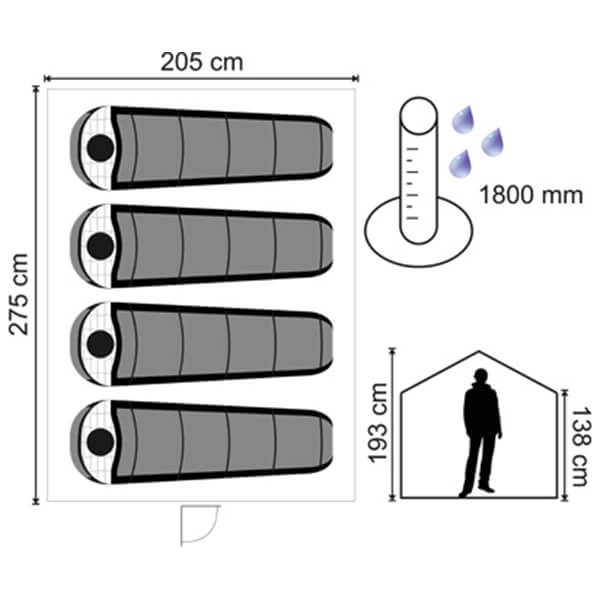 Σκηνή Camping 3 Εποχών, με χωρητικότητα 5 Ατόμων. -Διαθέτει 2 πόρτες και 4 παράθυρα με κουνουπιέρα. -Αδιαβροχοποίηση: 1800 mm. Μπορεί να ανταπεξέλθει σε μία απλή βροχή, κάνοντάς την ιδανική για χρήση την άνοιξη, το καλοκαίρι και το φθινόπωρο, αλλά όχι για τον χειμώνα. -Πάτωμα: Polyester Oxford. Διαστάσεις: 275 x 205 cm.Εσωτερικό ύψος: 193 cm.Υλικό: 420D Polyester Canvas PU coated.Σκελετός: Σωλήνες αλουμινίου 19 x 1.2mm.Βάρος: 13.4 kg.Χρώμα: Μπεζ.