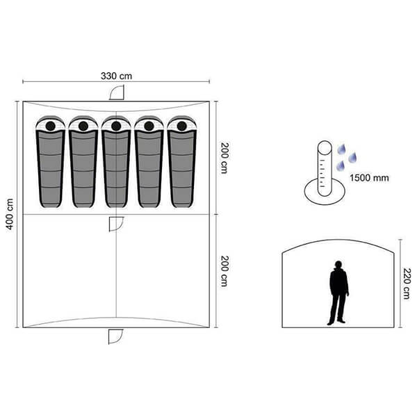 Σκηνή 3 Εποχών, με χωρητικότητα 10 Ατόμων. -Διαθέτει 3 πόρτες και 5 παράθυρα με κουνουπιέρα. -Διαθέτει κουνουπιέρα στην οροφή για εξαερισμό. -Διαθέτει υποδοχή λάμπας. -Αδιαβροχοποίηση: 1500 mm. Μπορεί να ανταπεξέλθει σε μία απλή βροχή, κάνοντάς την ιδανική για χρήση την άνοιξη, το καλοκαίρι και το φθινόπωρο, αλλά όχι για τον χειμώνα. -Με αντιηλιακή προστασία UV +30. -Πάτωμα: PE. Διαστάσεις: 400 x 330 cm.Εσωτερικό ύψος: 220 cm.Εξωτερικό Υλικό: Polyester 190T.Εσωτερικό Υλικό: Polyester 190T 600 mm.Μπανέλες: Fiberglass 11 mm.Βάρος: 17 kg.Χρώμα: Μπλε- μπεζ.