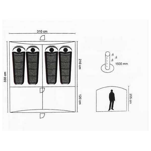 Σκηνή 3 Εποχών, με χωρητικότητα 6 Ατόμων. -Διαθέτει 3 πόρτες και 5 παράθυρα με κουνουπιέρα. -Διαθέτει κουνουπιέρα στην οροφή για εξαερισμό. -Διαθέτει υποδοχή λάμπας και τσέπες οργάνωσης. -Αδιαβροχοποίηση: 1500 mm. Μπορεί να ανταπεξέλθει σε μία απλή βροχή, κάνοντάς την ιδανική για χρήση την άνοιξη, το καλοκαίρι και το φθινόπωρο, αλλά όχι για τον χειμώνα. -Συμπεριλαμβάνονται 2 ορθοστάτες για τέντα. -Με αντιηλιακή προστασία UV +30. -Πάτωμα: PE. Διαστάσεις: 310 x 210 cm.Εσωτερικό ύψος: 220 cm.Υλικό: Polyester 190T.Σκελετός: Μπανέλες Fiberglass 11mm & σωλήνες stainless steel 19mm.Χρώμα: Μπλε.