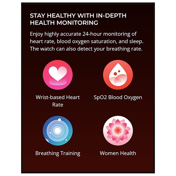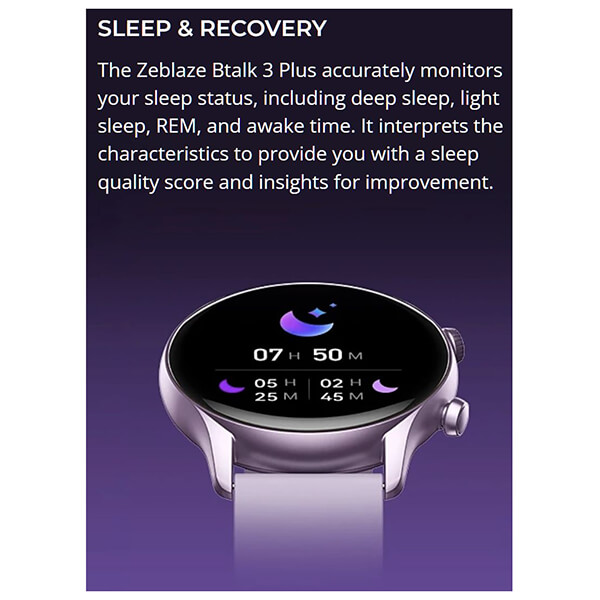 Το Zeblaze Btalk 3 Plus προσφέρει πρωτοποριακή παρακολούθηση της υγείας. Διαθέτει 24ωρη παρακολούθηση καρδιακών παλμών υψηλής ακρίβειας, μέτρηση κορεσμού οξυγόνου στο αίμα (SpO2) και ολοκληρωμένη ανάλυση ύπνου. Περιλαμβάνει επίσης ανίχνευση και εκπαίδευση του ρυθμού αναπνοής και χαρακτηριστικά για την υγεία των γυναικών.