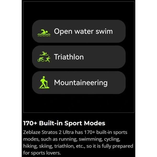 Με πάνω από 170 ενσωματωμένες λειτουργίες αθλημάτων, το Zeblaze Stratos 2 Ultra σας υποστηρίζει σε δραστηριότητες όπως τρέξιμο, ποδηλασία, κολύμβηση, πεζοπορία, σκι και πολλά άλλα.