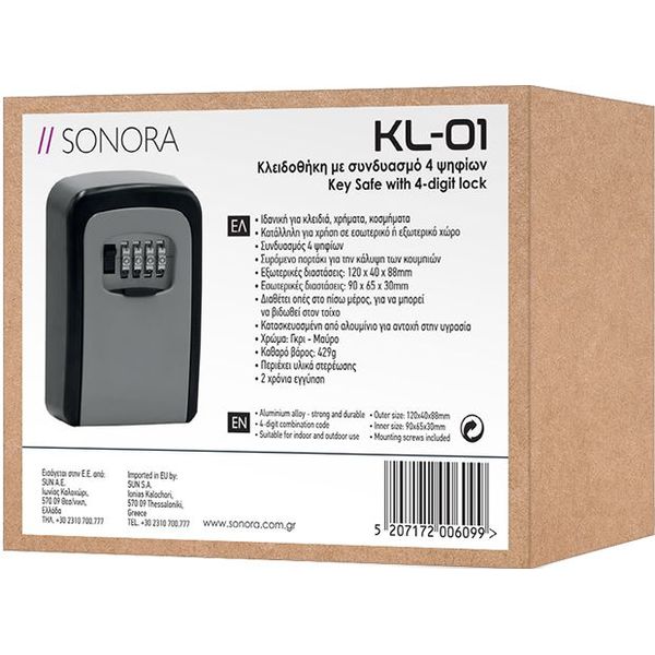 Μοιραστείτε τα κλειδιά σας με εύκολο και ασφαλή τρόπο, χάρη στην πρακτική κλειδοθήκη με συνδυασμό 4 ψηφίων SONORA KL-01. Ιδανική για Airbnb, ενοικιαζόμενα δωμάτια αλλά και για κάθε κατοικία, προσφέρει μία έξυπνη και οικονομική λύση ασφαλούς αποθήκευσης. Η κλειδοθήκη είναι κατασκευασμένη από ανθεκτικό κράμα αλουμινίου, ώστε να προστατεύει τα κλειδιά σας, χρήματα ή μικρού μεγέθους τιμαλφή από φθορές και υγρασία. Κατάλληλη για χρήση τόσο σε εσωτερικούς όσο και εξωτερικούς χώρους, προσφέρει μέγιστη προστασία των αντικειμένων σας χάρη στον συνδυασμό 4 ψηφίων, τον οποίο μπορείτε να προγραμματίσετε εύκολα. Διαθέτει εξωτερικές διαστάσεις 120 x 40 x 88mm και εσωτερικές διαστάσεις 90 x 65 x 30mm, παρέχοντας επαρκή χώρο για την ασφαλή αποθήκευση μικρών αντικειμένων. Στο πίσω μέρος διαθέτει οπές που επιτρέπουν την εύκολη και ασφαλή στερέωση στον τοίχο, ενώ το συρόμενο πορτάκι προστατεύει τα κουμπιά του συνδυασμού από τις καιρικές συνθήκες και τη φθορά. Στη συσκευασία περιλαμβάνονται όλα τα απαραίτητα υλικά στερέωσης για άμεση και εύκολη εγκατάσταση. Ιδανική για Airbnb κι ενοικιαζόμενα δωμάτια Κατάλληλη για χρήση σε εσωτερικό ή εξωτερικό χώρο, για ασφαλή αποθήκευση κλειδιών, χρημάτων, κοσμημάτων Συνδυασμός: 4 ψηφίων Συρόμενο πορτάκι για την κάλυψη των κουμπιών Εξωτερικές διαστάσεις: 120 x 40 x 88mm Εσωτερικές διαστάσεις: 90 x 65 x 30mm Διαθέτει οπές στο πίσω μέρος, για να μπορεί να βιδωθεί στον τοίχο Υλικό: Ανθεκτικό κράμα αλουμινίου για αντοχή στην υγρασία Χρώμα: Γκρι - Μαύρο Καθαρό βάρος: 429g Περιέχει υλικά στερέωσης Εγγύηση: 2 χρόνια
