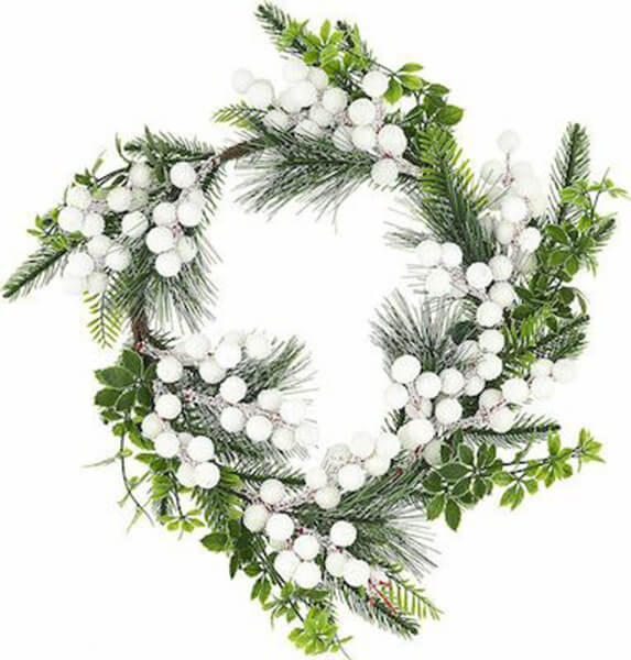 Διακοσμητικό στεφάνι με λευκούς καρπούς, κατάλληλη επιλογή για τη γιορτινή διακόσμηση του χώρου σας. • Διάμετρος: 35 cm. • Χρώμα: Λευκό-Πράσινο. • Βάρος: 0.167Kg. • Εγγύηση: 2 χρόνια.