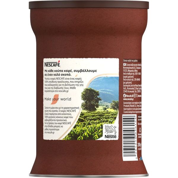Ξεκίνα τη μέρα σου με τη χαρακτηριστική γεύση που αγαπάς! Ο NESCAFE Classic 200g είναι ο κλασικός, αγαπημένος και διαχρονικός στιγμιαίος καφές, με γεμάτη, έντονη γεύση και πλούσιο άρωμα, χάρη στο προσεκτικό καβούρδισμα εκλεκτών κόκκων καφέ Robusta. Παράγεται από 100% φυσικούς κόκκους καφέ που καβουρδίζονται με φροντίδα για την απόλυτη γευστική εμπειρία.