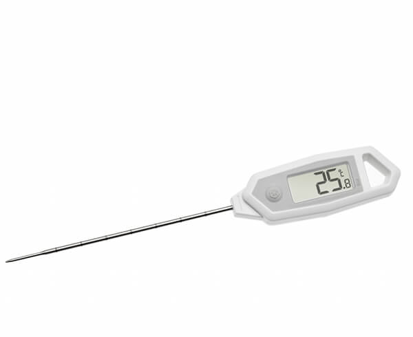 Αυτό το πρακτικό θερμόμετρο ανιχνευτής είναι ευέλικτο και εντυπωσιάζει με τον γρήγορο χρόνο απόκρισης και την υψηλή του ακρίβεια (από + -0,5 ° C). Απλώς αφαιρέστε το από το παρεχόμενο προστατευτικό κάλυμμα, τοποθετήστε τον αισθητήρα διείσδυσης από ανοξείδωτο χάλυβα στο αντικείμενο μέτρησης και πατήστε το κουμπί ON. Η μετρούμενη τιμή εμφανίζεται στην περιοχή από -40 έως +250 ° C μέσα σε 4 έως 5 δευτερόλεπτα. Ένας οπίσθιος φωτισμός μπορεί να ενεργοποιηθεί για καλύτερη ανάγνωση της θερμοκρασίας. Ανάλογα με το πώς κρατάτε το θερμόμετρο, η οθόνη μπορεί να περιστραφεί κατά 180° με το πάτημα ενός κουμπιού, ώστε να μπορεί να διαβαστεί εύκολα από αριστερόχειρες και δεξιόχειρες. Οι μετρούμενες μέγιστες και ελάχιστες τιμές αποθηκεύονται και μπορούν να ανακτηθούν. Το θερμόμετρο απενεργοποιείται αυτόματα μετά από 10 λεπτά. Η αυτόματη απενεργοποίηση μπορεί να απενεργοποιηθεί για μακροχρόνιες μετρήσεις. Ένα εργοστασιακό πιστοποιητικό με τρία σημεία μέτρησης (0 ° C / 100 ° C / 150 ° C) περιλαμβάνεται στάνταρ με αυτήν τη συσκευή. Έτσι, η συσκευή είναι ιδανική και για επαγγελματική χρήση, π.χ. για έλεγχο θερμοκρασίας τροφίμων στα πλαίσια των κανονισμών HACCP ή στο εργαστήριο. Περιλαμβάνεται η απαιτούμενη μπαταρία. Περιεχόμενα παράδοσης: Θερμόμετρο ανιχνευτή, πιστοποιητικό εργοστασίου, μπαταρία, εγχειρίδιο οδηγιών.Εύρος μέτρησης θερμοκρασίας: -40...+250°C (-40...+482°F) .Υλικό: Πλαστικό.Μπαταρίες: 1 x 3V CR2032.Διαστάσεις (ΜxΠxΥ): 206x31x18 mm.Βάρος: 43 g.Χρώμα: Λευκό.Εγγύηση: 2 χρόνια. DOA 7 ημερών