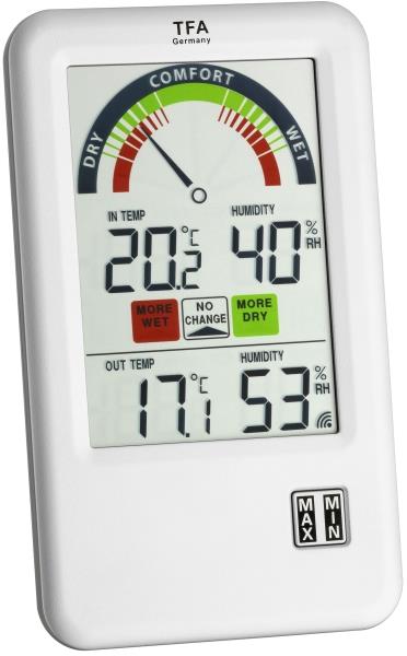 TFA στην κατηγορία ΜΕΤΕΩΡΟΛΟΓΙΚΟΙ ΣΤΑΘΜΟΙ Έλεγχος θερμοκρασίας περιβάλλοντος δωματίου και εξωτερικών συνθηκών. Έχει την δυνατότητα για ασύρματη μετάδοση θερμοκρασίας, και υγρασίας μέσω του πομπού (max.100 m).