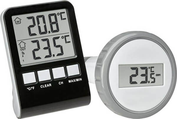 Ασύρματο θερμόμετρο πισίνας για να ελέγξετε τη θερμοκρασία του νερού ανά πάσα στιγμή - από την άνεση του σαλονιού σας. -Ο αιωρούμενος πομπός πισίνας μεταδίδει τις πληροφορίες απευθείας και ασύρματα στον σταθμό, αλλά έχει και τη δική του ένδειξη θερμοκρασίας. Ο αισθητήρας μετρά σε βάθος μέτρησης 120 mm. -Μπορείτε επίσης να μάθετε για τη θερμοκρασία δωματίου στο χώρο εγκατάστασης. Οι μέγιστες και ελάχιστες τιμές αποθηκεύονται και εμφανίζονται με το πάτημα ενός κουμπιού. -Προαιρετικά, μπορούν να συνδεθούν 2 ακόμη πομποί πισίνας. Χαρακτηριστικά Εύρος μέτρησης θερμοκρασίας πισίνας: -20°C - 60°C.Εύρος μέτρησης εσωτερικής θερμοκρασίας: -10°C - 50°C.Μέγιστη εμβέλεια: 60 m.Υλικό: Πλαστικό.Μπαταρίες: 2x AAΑ 1.5 V (σταθμός βάσης), 2x AAΑ 1.5 V (πομπός).Διαστάσεις: 70 x 23 x 98 mm.Βάρος: 65 gr.Εγγύηση: 2 χρόνια. DOA 7 ημερών