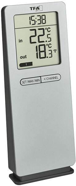Θερμόμετρo για να είστε ενήμεροι σχετικά με την τρέχουσα θερμοκρασία σε έναν συγκεκριμένο χώρο. -Μπορείτε να το τοποθετήσετε εσωτερικά σε οποιοδήποτε χώρο του σπιτιού ή ακόμα και εξωτερικά σε μπαλκόνι ή κήπο. -Μπορείτε να το εγκαταστήσετε σε κάποιο έπιπλο, όμως σε κάθε περίπτωση θα πρέπει να το τοποθετείτε σε σημείο με όσο το δυνατόν πιο ουδέτερες συνθήκες. -Αν προορίζεται για εσωτερική χρήση δεν θα πρέπει το τοποθετήσετε κοντά σε κάποιο θερμαντικό σώμα ή σε κλιματιστικό καθώς οι μετρήσεις που θα πάρετε δεν θα είναι ενδεικτικές. -Αν προορίζεται για εξωτερική χρήση θα πρέπει να το τοποθετήσετε σε ένα σκιερό μέρος και τουλάχιστον 1.5 μέτρο πάνω από το έδαφος. -Οι μέγιστες και ελάχιστες τιμές αποθηκεύονται και εμφανίζονται με το πάτημα ενός κουμπιού. -Η απεικόνιση των μετρήσεων είναι ψηφιακή, ενώ μπορούν να συνδεθούν δύο επιπλέον πομποί για έλεγχο θερμοκρασίας. Χαρακτηριστικά Εύρος μέτρησης εξωτερικής θερμοκρασίας: -40°C - 60°C.Εύρος μέτρησης εσωτερικής θερμοκρασίας: 0°C - 50°C.Μέγιστη εμβέλεια: 100 m.Υλικό: Πλαστικό.Μπαταρίες: 2x AA 1.5 V (σταθμός βάσης), 2x AA 1.5 V (πομπός).Διαστάσεις: 64 x 26 x 155 mm.Βάρος: 92 gr.Χρώμα: Ασημί.Εγγύηση: 2 χρόνια. DOA 7 ημερών