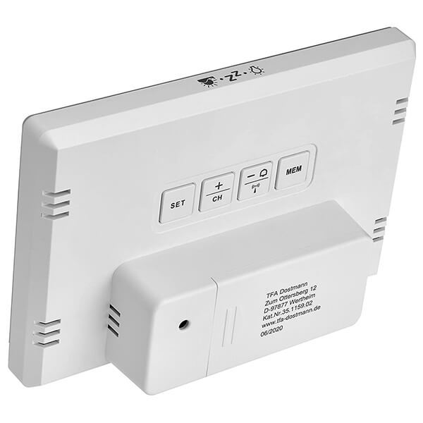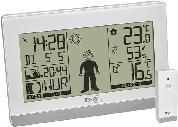 Μετεωρολογικός σταθμός TFA ο οποίος εντυπωσιάζει όχι μόνο μέσω της κομψής σχεδίασής του, αλλά και μέσω των διαφορετικών ενδυματολογικών προτάσεων που ταιριάζουν με την τρέχουσα εξωτερική θερμοκρασία, τις οποίες λαμβάνετε καθημερινά άμεσα προσαρμοσμένες στην τοποθεσία σας. -Μπορείτε ανά πάσα στιγμή να γνωρίζετε την τρέχουσα θερμοκρασία και τη σχετική υγρασία σε έναν συγκεκριμένο χώρο. -Παράλληλα εμφανίζει τη θερμοκρασία που επικρατεί στον εξωτερικό χώρο μέσω ασύρματου πομπού. -Μπορείτε επίσης να τον χρησιμοποιήσετε και σαν διακοσμητικό στοιχείο στον χώρο σας, αφού λειτουργεί και ως ρολόι. -Επιπλέον, με τη λειτουργία αφύπνισης μπορεί να παράγει έναν ήχο ειδοποίησης σε συγκεκριμένη ώρα που του έχετε ορίσει. -Με λειτουργία Max.-Min. που σας δίνει τη δυνατότητα να αναζητήσετε επιπλέον τις υψηλότερες και τις χαμηλότερες τιμές για την εξωτερική θερμοκρασία καθώς και για τη θερμοκρασία και την υγρασία του αέρα στον εσωτερικό χώρο. -Η καθαρή οθόνη του μετεωρολογικού σταθμού δείχνει την ώρα για την ανατολή και τη δύση του ηλίου με τη διάρκεια της ημέρας και την τρέχουσα φάση της σελήνης στην τοποθεσία σας. -Για να διασφαλίσετε ότι η ψηφιακή οθόνη είναι ευανάγνωστη τη νύχτα, ένας μπλε φωτισμός φόντου μπορεί να ενεργοποιηθεί για 10 δευτερόλεπτα πατώντας το κουμπί του αισθητήρα. -Η απεικόνιση των μετρήσεων είναι ψηφιακή, που σημαίνει ότι η συσκευή εμφανίζει αριθμητικά όλες τις ενδείξεις. Επιπλέον, απεικονίζει γραφικά την πρόβλεψη του καιρού. -Μπορείτε να τον εγκαταστήσετε σε κάποιο έπιπλο, όμως σε κάθε περίπτωση θα πρέπει να τον τοποθετείτε σε σημείο με όσο το δυνατόν πιο ουδέτερες συνθήκες. Χαρακτηριστικά Εξωτερική θερμοκρασία: -25°C - +60°C.Υγρασία: 20 - 95%.Εμβέλεια: 60m.Εσωτερική θερμοκρασία: -10°C - +50°C.Υλικό: πλαστικό. Μπαταρίες: 2 x AAA (σταθμός βάσης), 2 x AA (πομπός).Διαστάσεις: 145 x 39 x 97 mm.Βάρος: 189 g.Χρώμα: Λευκό.Εγγύηση: 2 χρόνια. DOA 7 ημερών
