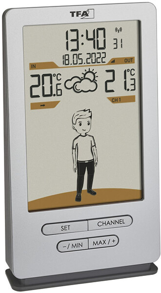 Whether you're working in the garden today or prefer to stay indoors, Weather Jack makes the decision easy for you. Instead of just numbers, you have a clear picture immediately: 28 different clothing options clearly show what weather you can prepare for today and what clothing is appropriate for it. You can now make weather-dependent decisions faster and plan activities better: Can the party take place outside? Will the outdoor excursion with friends work out? What will the children wear today? Weather Jack knows the answer. Guesswork is no longer necessary. Its large display also gives you other important data at your fingertips. You immediately know the date and time to the second, how the air pressure is shaping up and what the temperatures are inside and outside. The wireless outdoor transmitter has a range of 100 metres. It is set up outdoors and detects the temperature there. An integrated sensor measures the room temperature at the location where the station is set up. Would you like to keep an eye on the temperature in other rooms? Two additional temperature transmitters, available separately, can be connected. This way, you can quickly decide whether, for example, the children's room needs to be ventilated or the office heated. Delivery contents: Wireless weather station, temperature trasmitter, instruction manual.Measuring range temperature indoor: 0 ...+50°C.Measuring range temperature outdoor: -40 ...+60°C.Clock: Radio-controlled clock.Time zone correction: +12/-12h.Maximum range: 100 m.Maximum amount of transmitters: 3.Transmitter included in delivery: 30.3250.02.Transmission frequency: 433 MHz.Material: Plastic.Batteries: 2 x AA 1.5 V (base station), 2 x AA 1.5 V (transmitter).Dimensions (LxWxH): 82x47x140 mm.Weight: 127 g.Color: Silver.Warranty: 1 year.