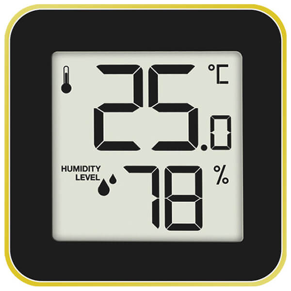 Ψηφιακό θερμόμετρο και υγρόμετρο εσωτερικού χώρου, σε μαύρο χρώμα με πλαίσιο αλουμινίου. Κομψό και minimal, με ευκρινή LCD οθόνη και ευανάγνωστα ψηφία, για να παρακολουθείτε την θερμοκρασία και τα επίπεδα υγρασίας στον χώρο σας, ενώ παράλληλα προσδίδει και μια πινελιά design στο σαλόνι σας. Μπορεί να τοποθετηθεί οπουδήποτε εσείς θέλετε στον χώρο σας, αφού λειτουργεί με μπαταρίες. Χαρακτηριστικά: - Minimal Design με πλαίσιο αλουμινίου. - Εμφάνιση κατώτατης/μέγιστης θερμοκρασίας και υγρασίας (min/max) . - Οθόνη LCD με μεγάλα ψηφία. - Δυνατότητα επιτραπέζιας ή επιτοίχιας τοποθέτησης. Εύρος μέτρησης εσωτερικής θερμοκρασίας: 0° C - +50° C (+32° F - +122° F).Εύρος μέτρησης εσωτερική υγρασίας: 20% - 95% RH.Διαστάσεις οθόνης: 4.4 x 4.4 cm.Τροφοδοσία: 1 x ΑΑΑ μπαταρία.Διαστάσεις: 6.5 x 6.5 x 2cm.Χρώμα: Κίτρινο.Εγγύηση: 2 χρόνια.