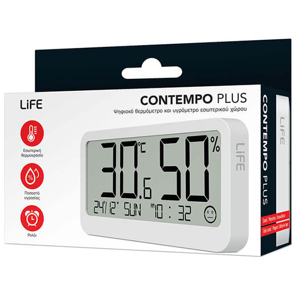 Ψηφιακό θερμόμετρο και υγρόμετρο εσωτερικού χώρου. -Κομψό, minimal σε λευκό χρώμα, είναι ένα τέλειο gadget για κάθε δωμάτιο του σπιτιού σας. -Διαθέτει ευκρινή LCD οθόνη και ευανάγνωστα ψηφία, με προβολή ώρας, ημερομηνίας, εσωτερικής θερμοκρασίας και επίπεδο υγρασίας του χώρου σας. -Επιπλέον, διαθέτει προβολή υψηλότερης/χαμηλότερης θερμοκρασίας και υγρασίας, καθώς και 5 εικονίδια επιπέδου άνεσης, ανάλογα με το ποσοστό υγρασίας του χώρου. -Μπορείτε να επιλέξετε ανά πάσα στιγμή με το πάτημα ενός πλήκτρου μεταξύ δύο θεμάτων κύριας προβολής: θερμοκρασία και υγρασία με μεγάλα ψηφία και ώρα-ημερομηνία με μικρά ψηφία / ώρα και ημερομηνία με μεγάλα ψηφία και θερμοκρασία-υγρασία με μικρά ψηφία. Λειτουργεί με μπαταρία και μπορεί να τοποθετηθεί οπουδήποτε εσείς θέλετε στον χώρο σας, αφού διαθέτει 4 διαφορετικές λύσεις τοποθέτησης: Πρακτικό αναδιπλούμενο stand επιτραπέζιας τοποθέτησηςΚρυφό μαγνήτη στο πίσω μέροςΑυτοκόλλητο γαντζάκι ο οποίος προσαρτάται στην υποδοχή για καρφίΥποδοχή για στερέωση σε καρφί τοίχουΧαρακτηριστικά Εύρος μετρήσιμης εσωτερικής θερμοκρασίας: -10°C - +50°C.Εύρος μετρήσιμης εσωτερικής υγρασίας: 20% - 95% RH.Διαστάσεις: 106.5 x 54.5 x 13 mm.Χρώμα: Λευκό.Μπαταρία: 1 x CR2032 (συμπεριλαμβάνεται).Εγγύηση: 2 χρόνια.